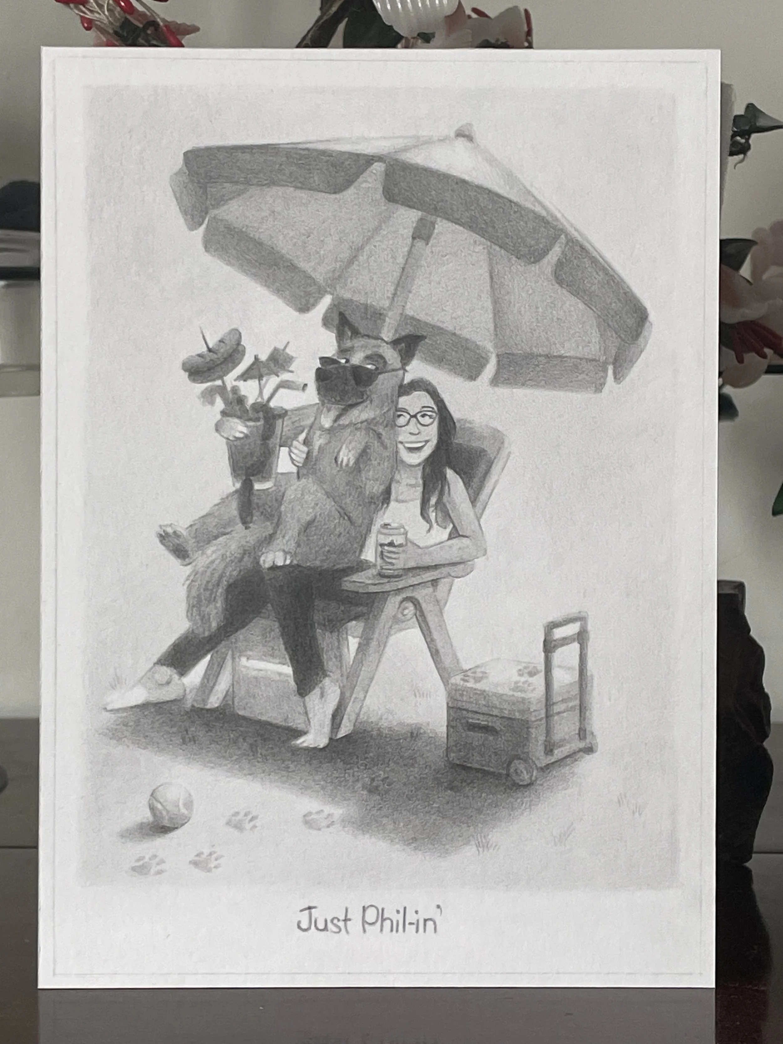 "Just Phillin'" - cartoon funny created for my sister's birthday. Here is Phil (Phillipe) her rescue dog. He is goofy, endlessly lovable, and Phil loves her to pieces.